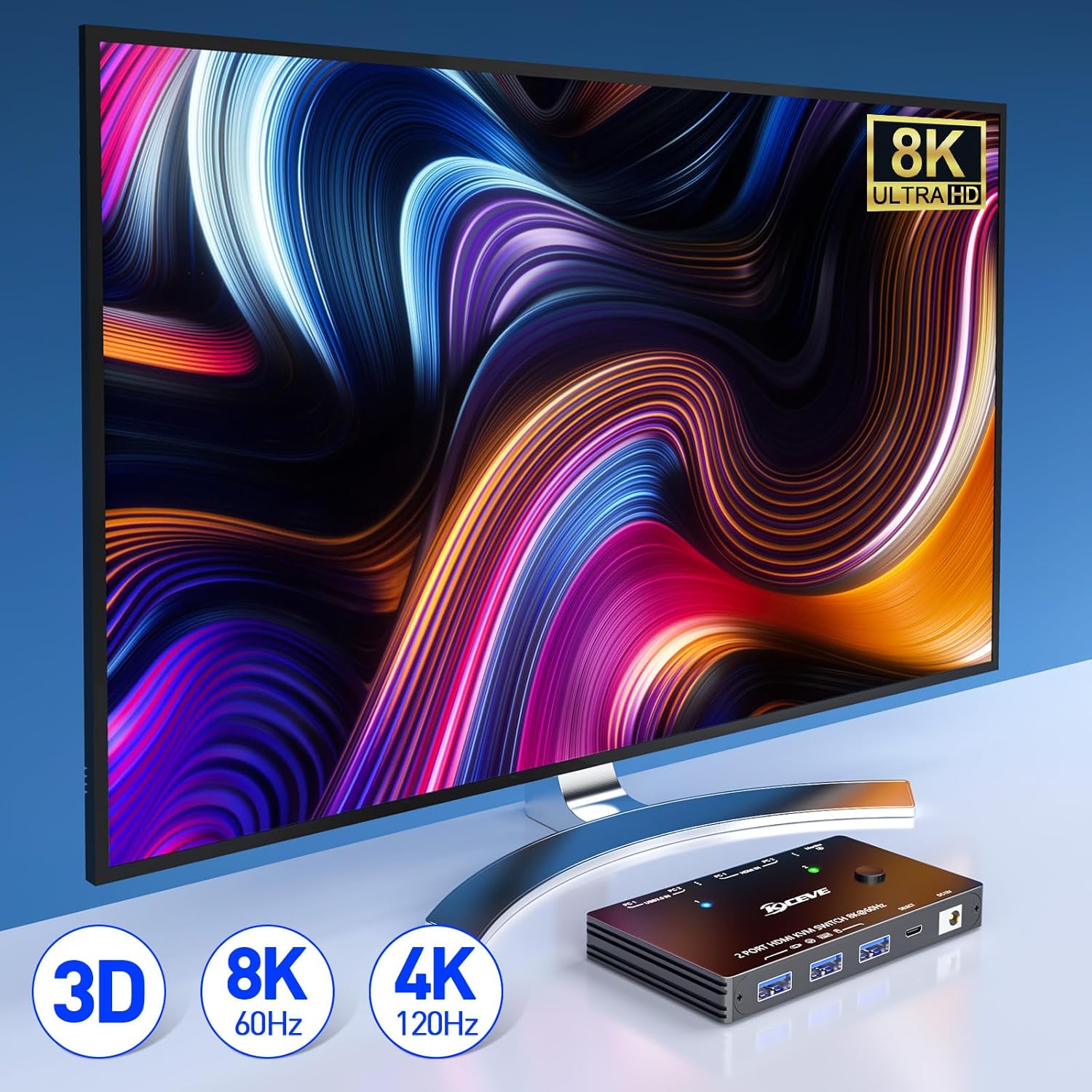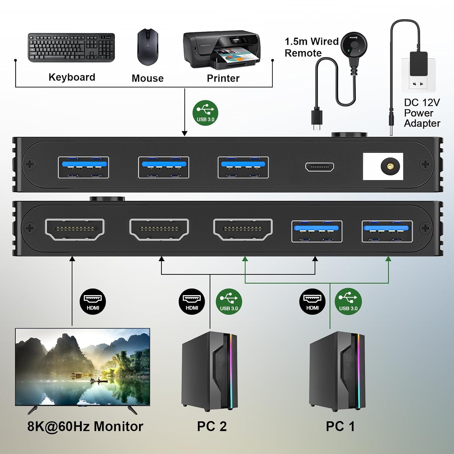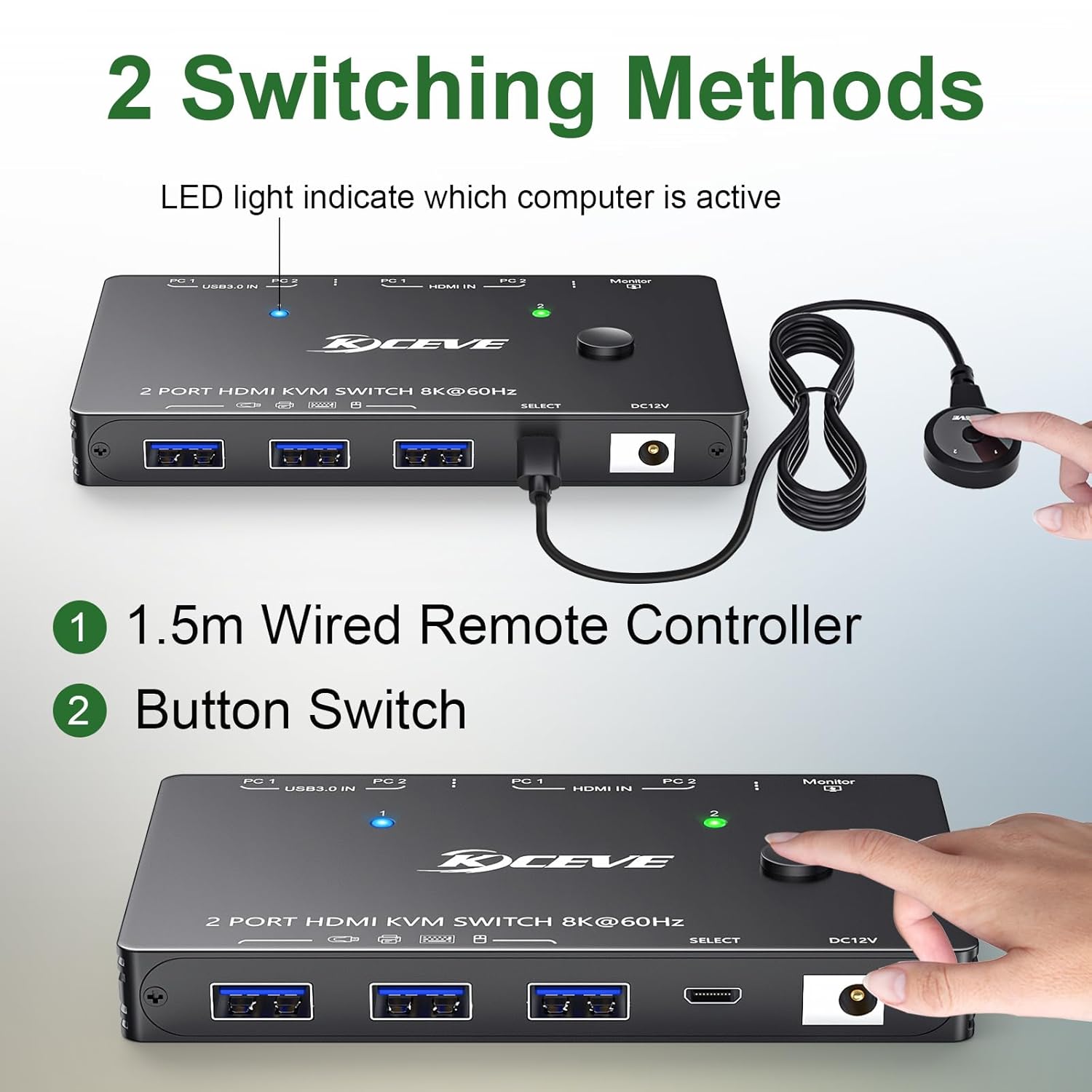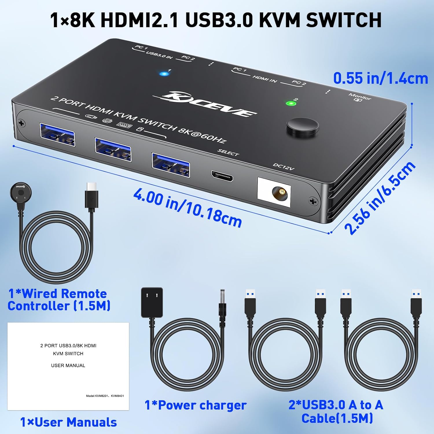 8K@60HZ HDMI KVM Switch for 2 Computer share 1 Monitor and 3 USB Devices