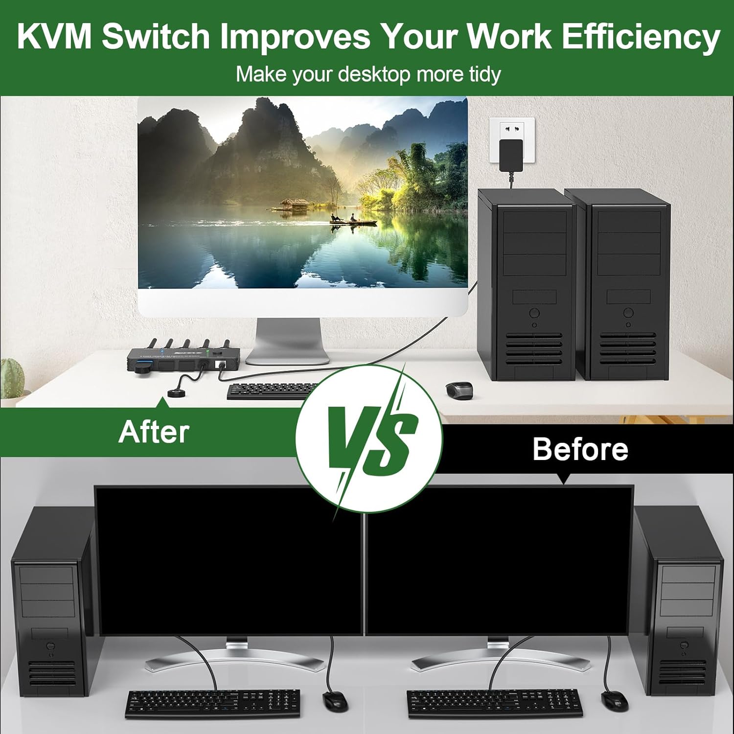 【8K KVM Switch】 This KVM switch perfect for hooking up 2 desktops or laptops to share one set of wired or wireless keyboard mouse and 1 monitor.