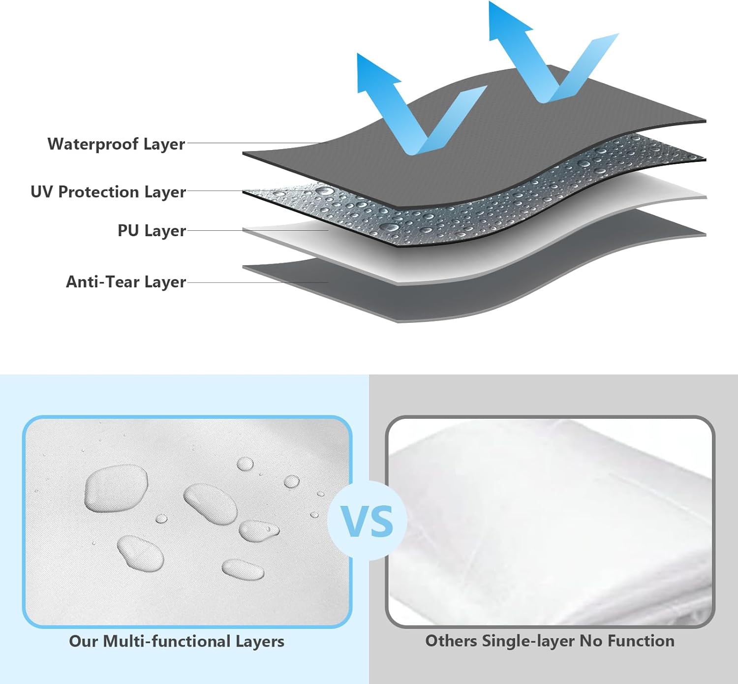 Fabric: WILDPATH canopy tent sidewall is made of heavy-duty 300D Oxford fabric with a silver coating on the back that blocks 99% of UV rays. Resistant to all types of weather, it provides superior water, wind and dust resistance, effectively blocks rain and keeps the interior dry and comfortable.