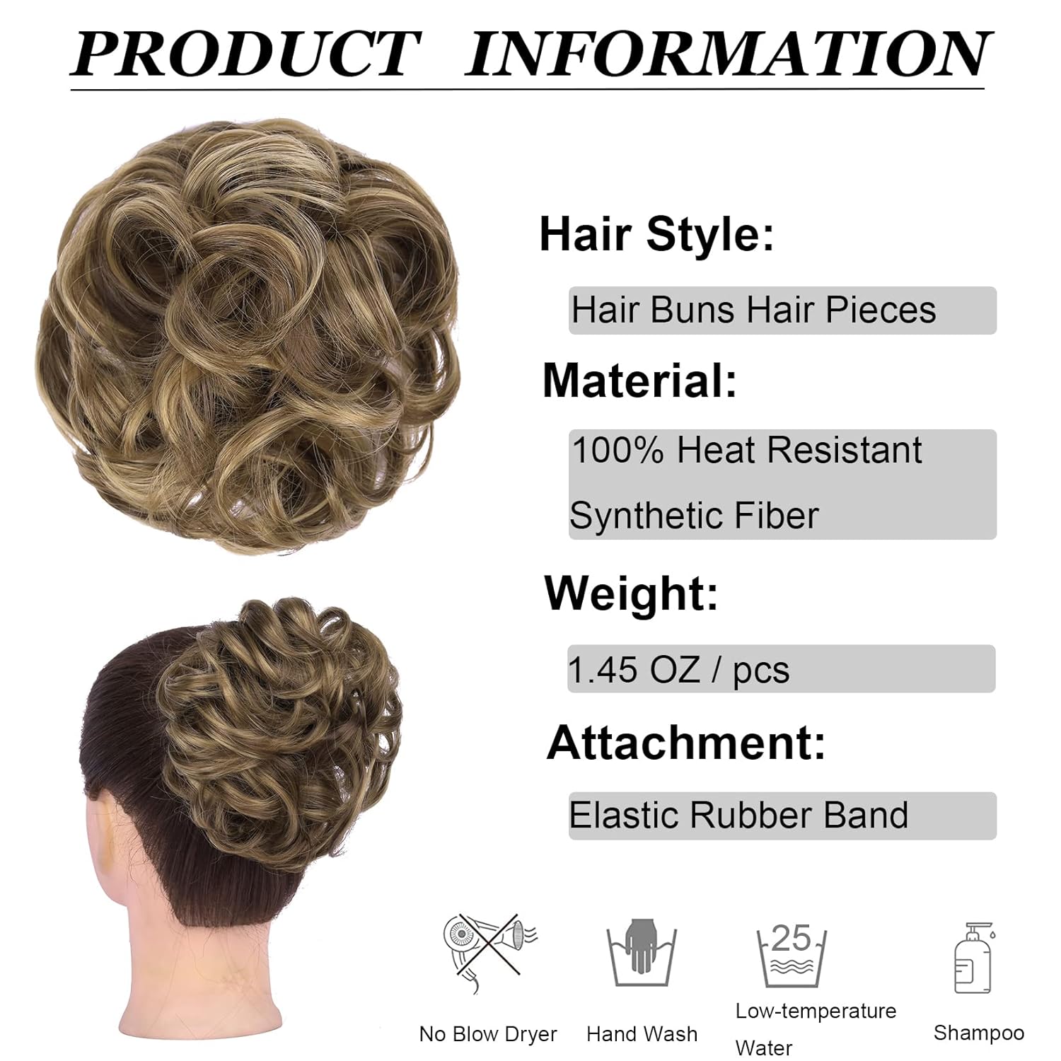Material:The messy curly bun hairpiece with elastic rubber band is made of the 100% Heat Resistant Synthetic Fiber, which looks and feels like the real human hair, completely natural, light and soft.
