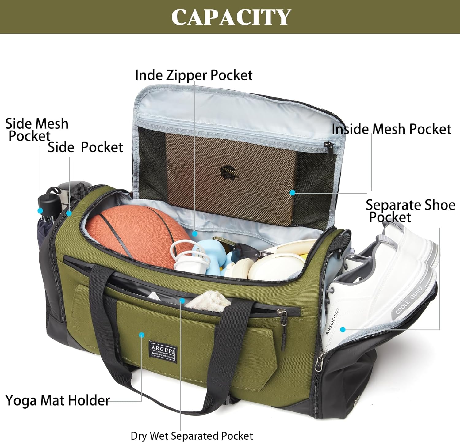 [Shoe Compartment] Features A Large Bottom Zipper Pocket To Separate Shoes, Toiletries, Clothes And Other Items. travel Duffle Bag Is Perfect For An Overnight Stay Or A Carry-on Addition To Your Luggage. Fits up to a men’s size 14 shoe!The shoes compartment has 2 air vents to disperse the bad smell of shoes.