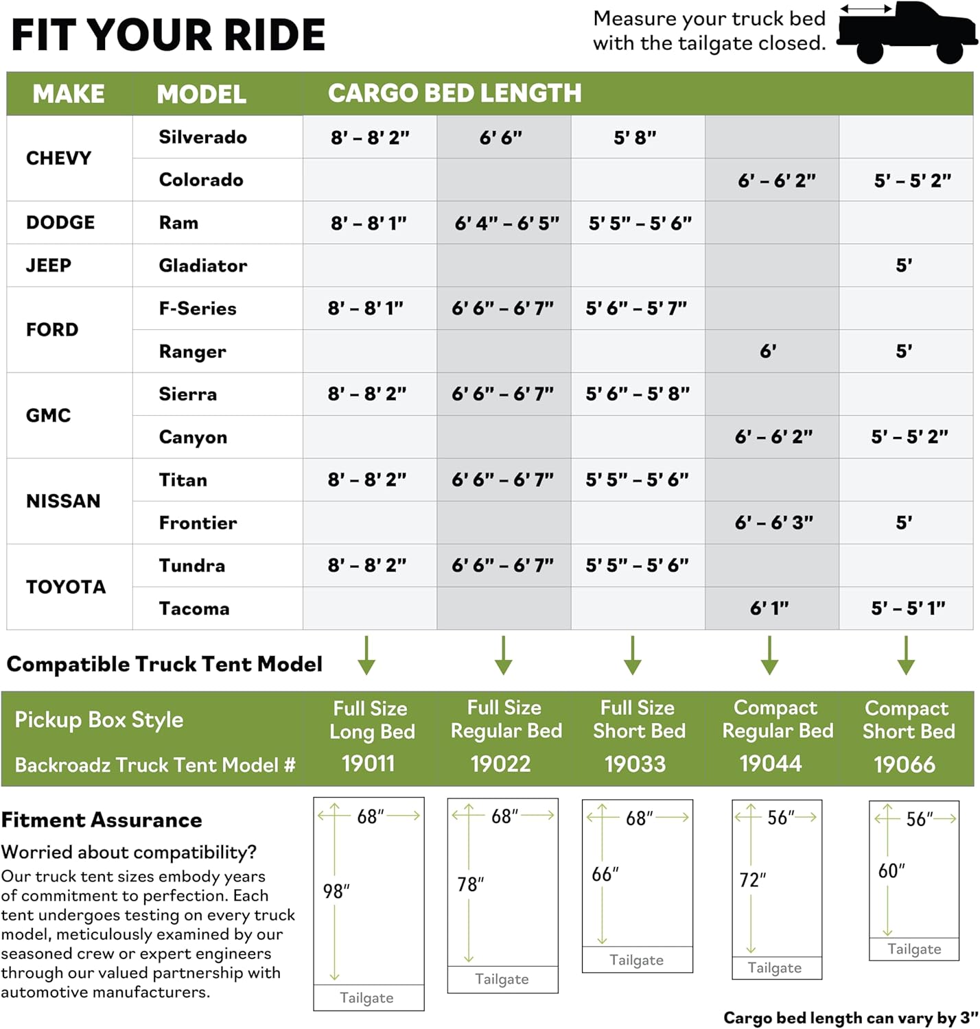 Spacious and Cozy: The Backroadz Truck Tent allows you to camp in the bed of your pickup truck – quickly creating the ultimate camping oasis wherever your truck may take you. It features a spacious interior with ample headroom and cozy sleeping area for two. Rugged polyethylene bathtub floor keeps you clean from your truck and dry from the elements. A large entry door for easy entry and full use of tailgate. The two large mesh windows and rear ceiling vent allows for optimal ventilation.