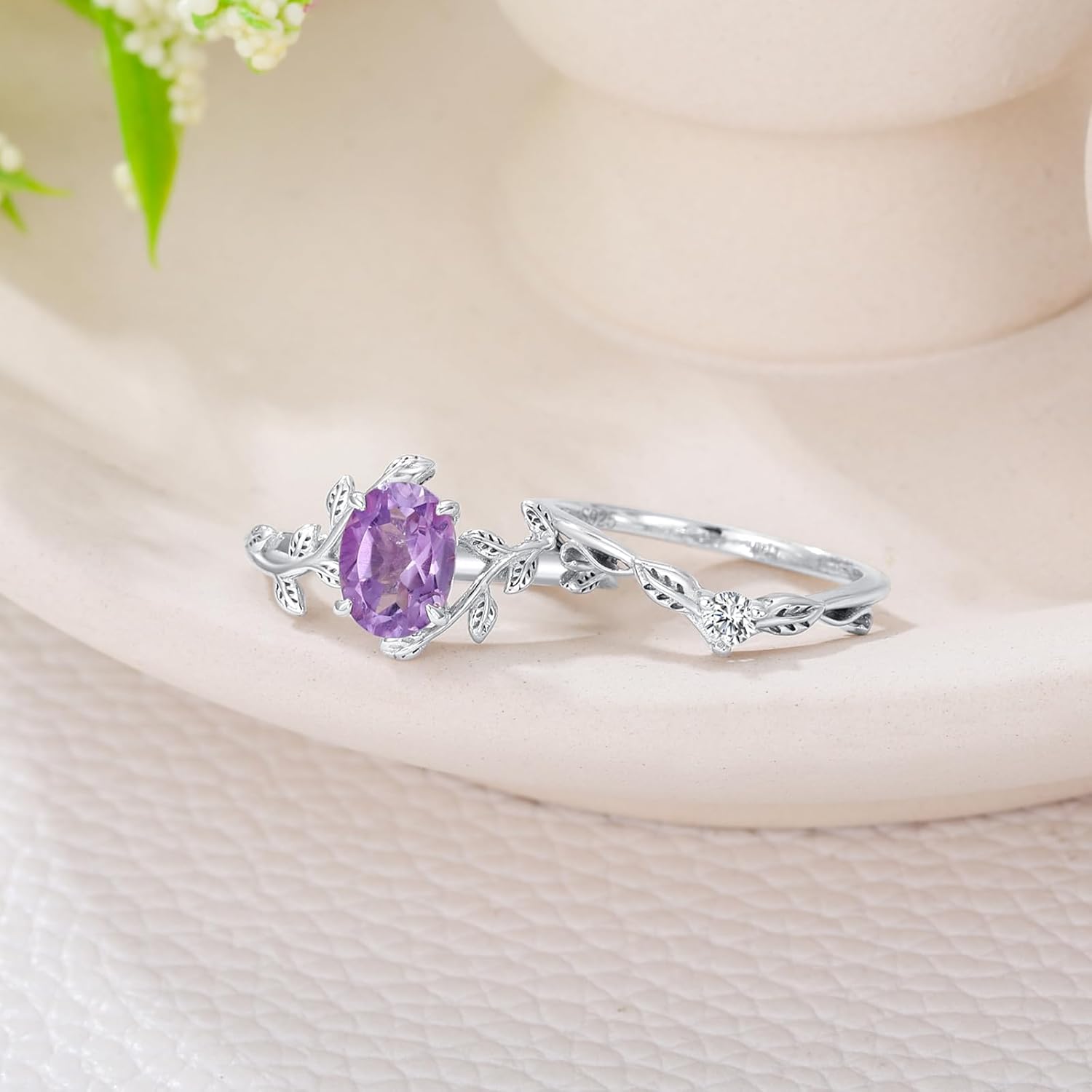 Oval Shaped Gemstone Engagement Rings Set for Women 925 Sterling Silver,8×6 MM Amethyst Leaf Ring Unique Bridal Wedding Rings Size 3-13