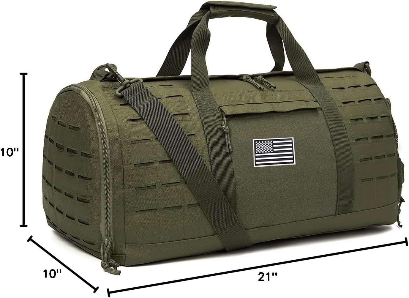 【PERSONALISE】 The Laser Cut Molle Webbing Design making this tactical duffle bag special. it uses Two Layers Fabric Laser Cutting MOLLE Hang System to allow all range of pouches attachment. Large area of Velcro to personalise with our range of patches. One US flag patch for gift(can be removed).