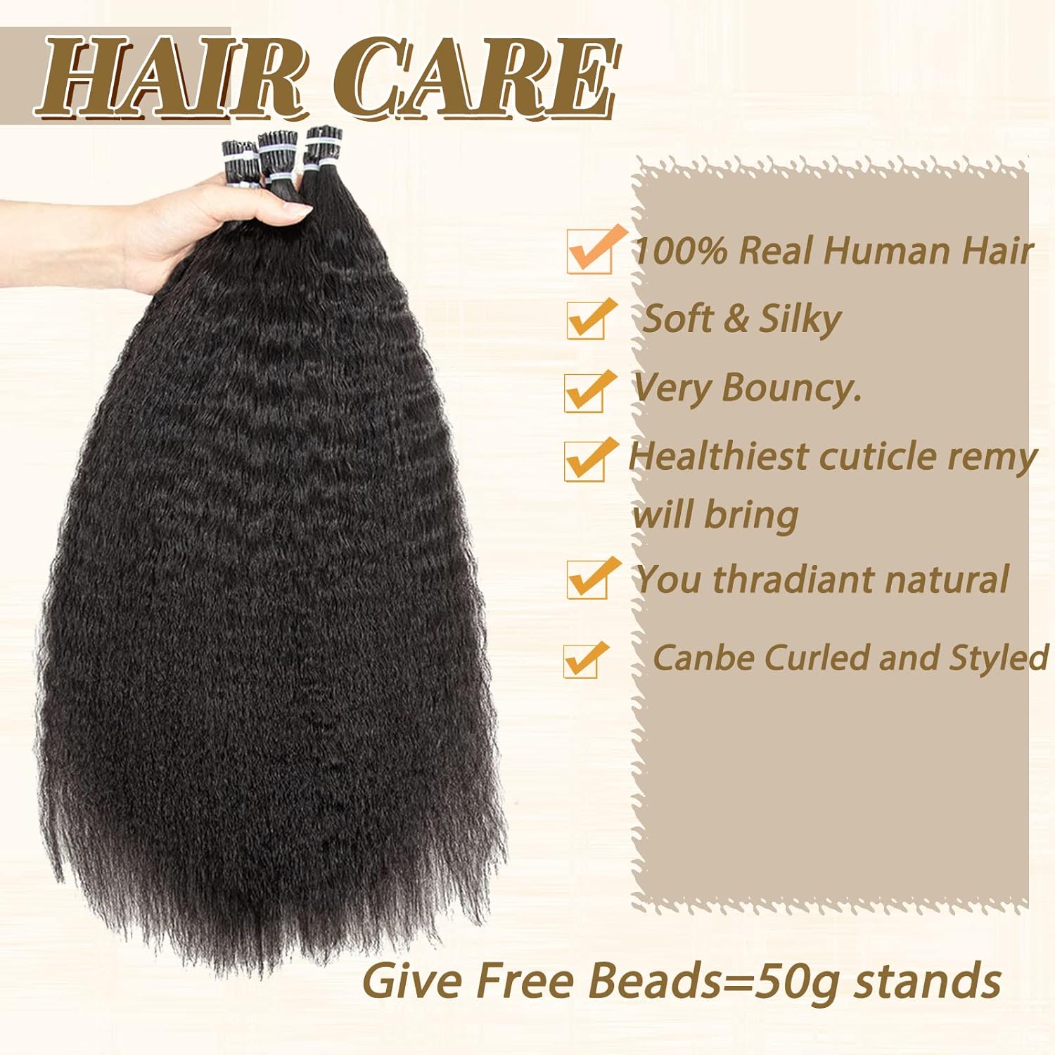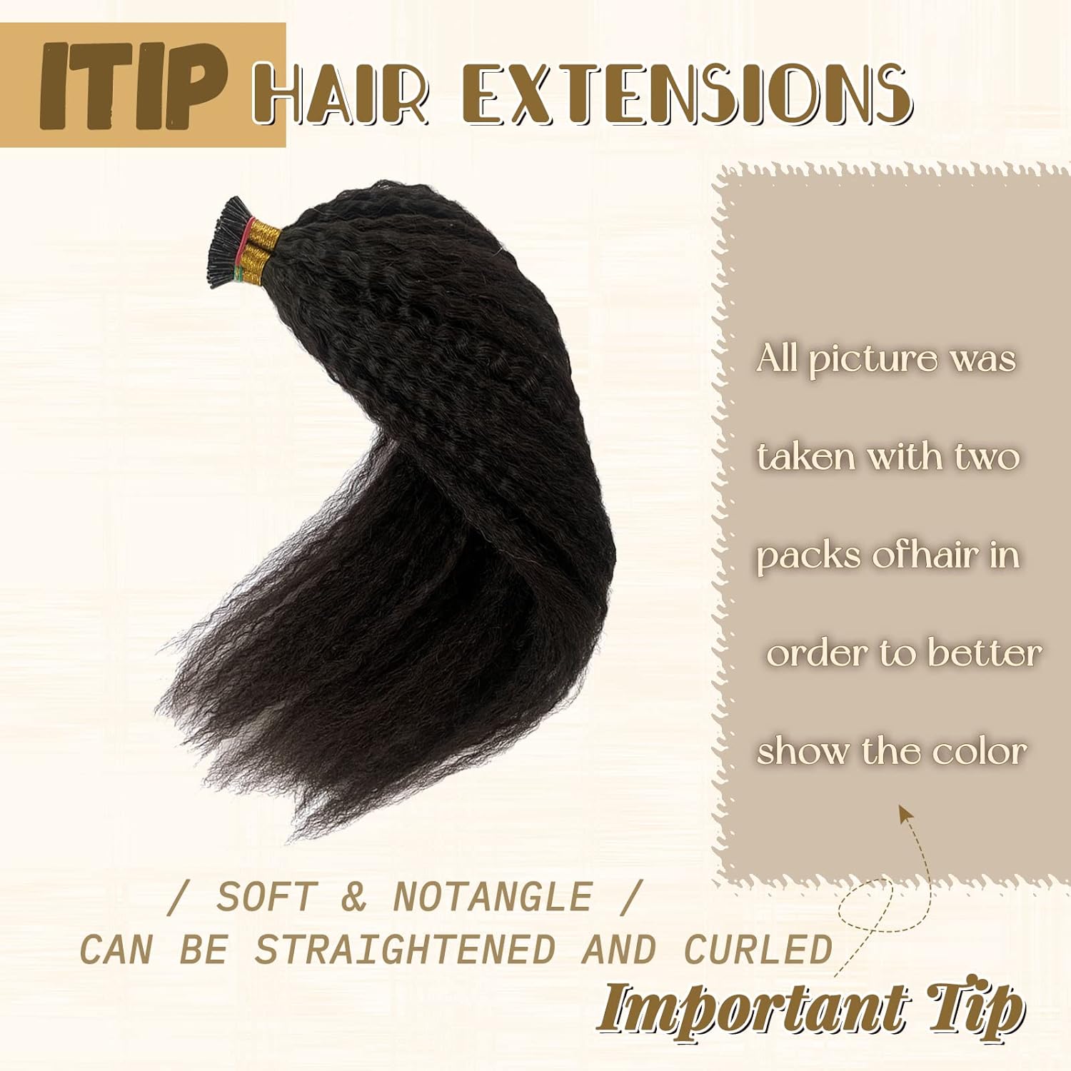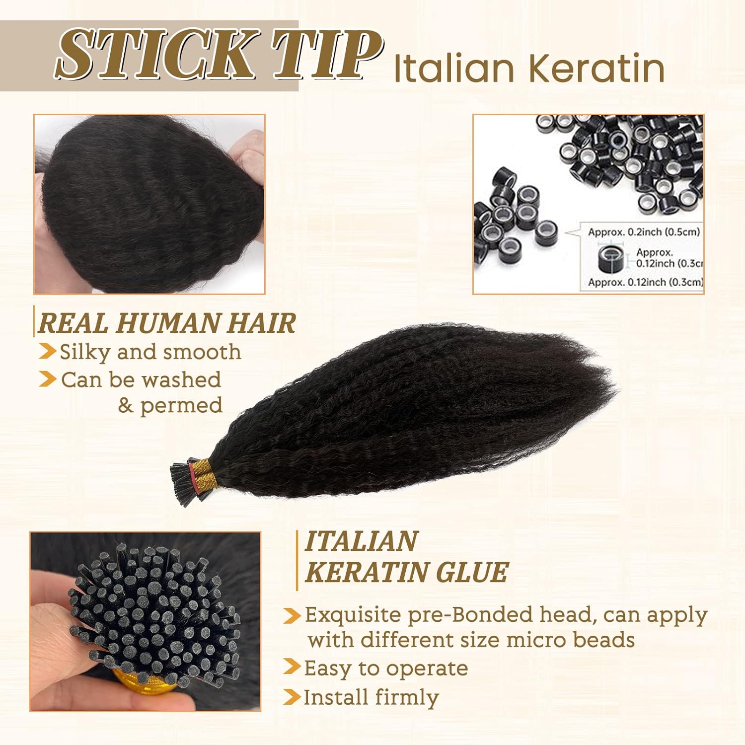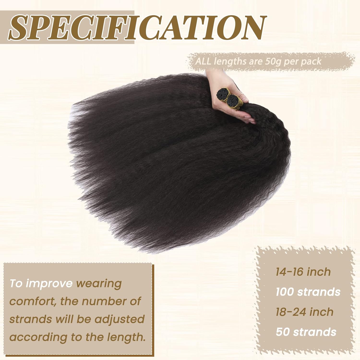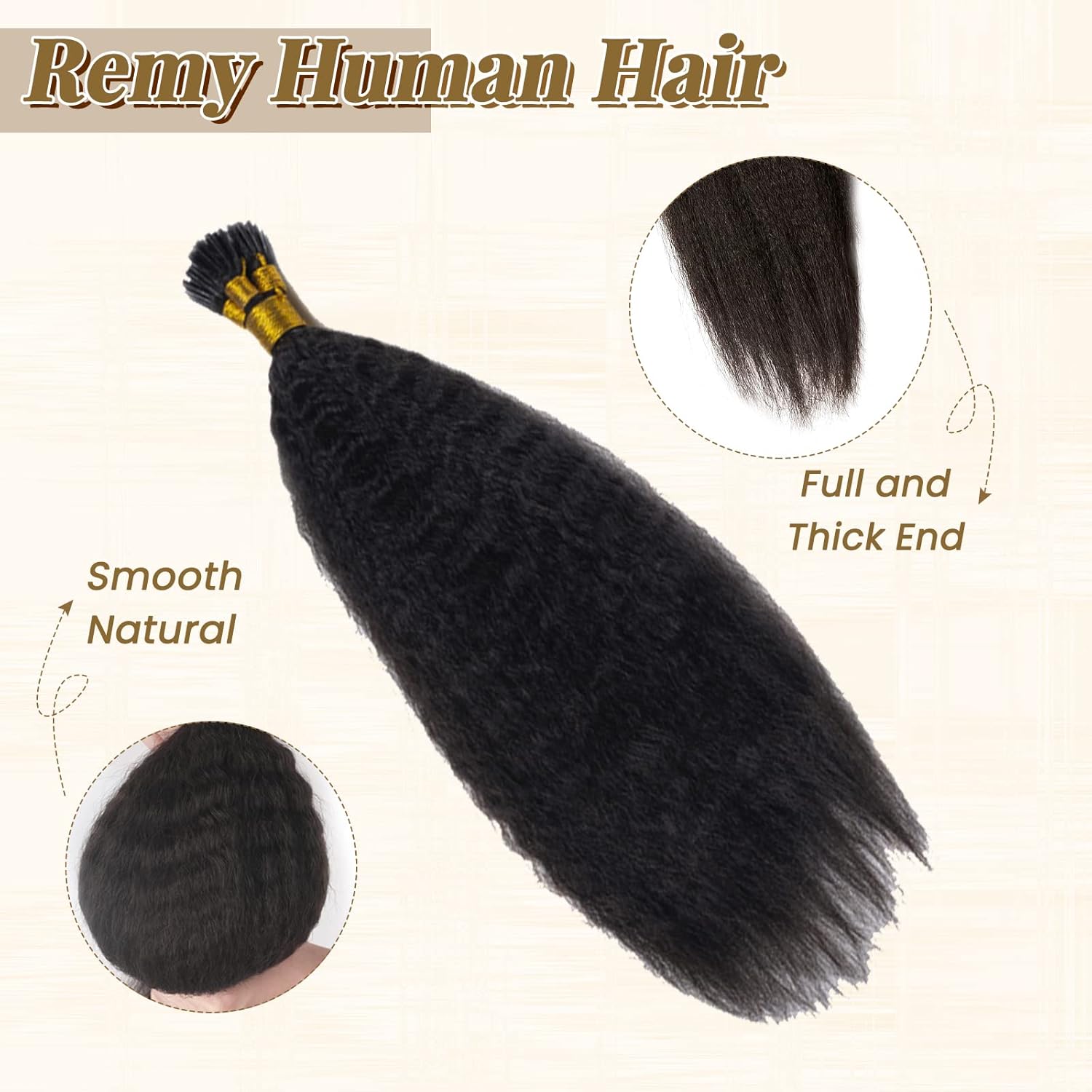 Remy I Tip Hair Extensions Human Hair for Black Women, Natural Black Kinky Straight Hair Extensions 18inch Cold Fusion Stick Tip Extension 2-3 Pack Full Ends 50strands 50g