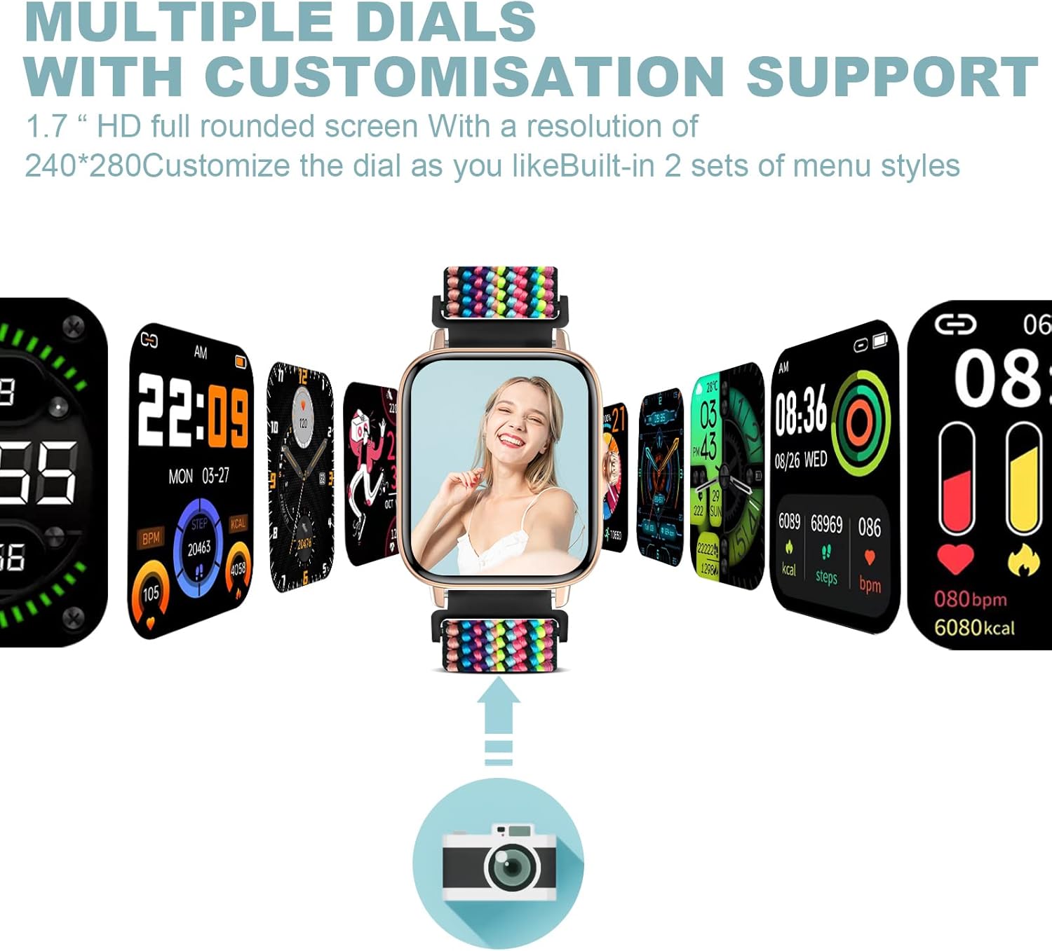 1.7” HD COLOR TOUCH SCREEN: The big size screen makes it easier to operate, 240*280 HD resolution, the colors are brighter and pictures are clearer. Metal alloy housing and 46g weight makes it easy to wear, and the skin-friendly silicone strap can be weared more comfortable. You can choose the 100+ fixed personalized dials or set your favorite photo from phones as watch face