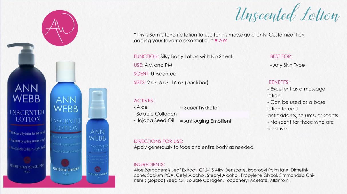 Ann Webb Unscented Lotion is a silky Lotion, perfect for all skin types, especially sensitive skin. It moisturizes deeply without leaving a greasy feeling, providing lasting hydration to keep skin feeling soft and comfortable all day.